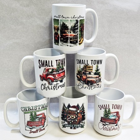 15oz Ceramic Mug SMALL TOWN CHRISTMAS All White Inner & Handle Two-Sided Printing 6 Assorted Designs *minimum order 6 mugs mix* (order in increments of 6)