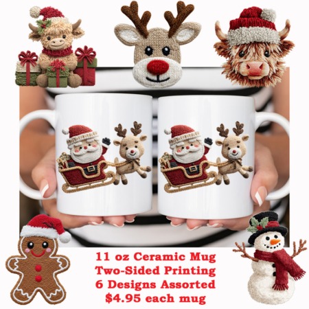 11oz Ceramic Mug FAUX KNIT STITCHING CHRISTMAS ICONS All White Inner & Handle Two-Sided Printing 6 Assorted Designs *minimum order 6 mugs mix* (order in increments of 6)
