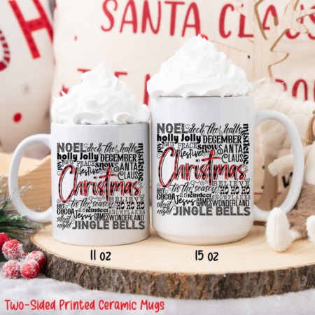 11oz Ceramic Mug ARTSY CHRISTMAS WORDS All White Inner & Handle Two-Sided Printing One Design *minimum order 6 mugs* (order in increments of 6)