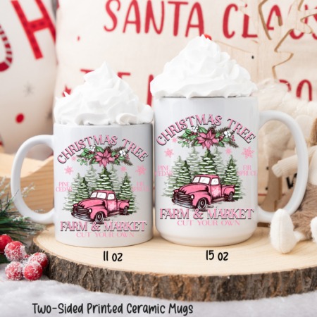 11oz Ceramic Mug CHRISTMAS TREE FARM & MARKET PINK All White Inner & Handle Two-Sided Printing One Design *minimum order 6 mugs* (order in increments of 6)