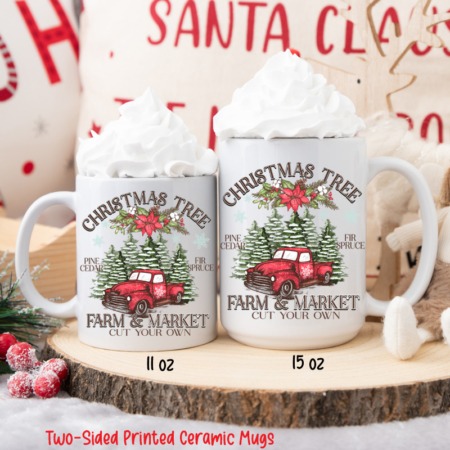 15oz Ceramic Mug CHRISTMAS TREE FARM & MARKET RED All White Inner & Handle Two-Sided Printing One Design *minimum order 6 mugs* (order in increments of 6)