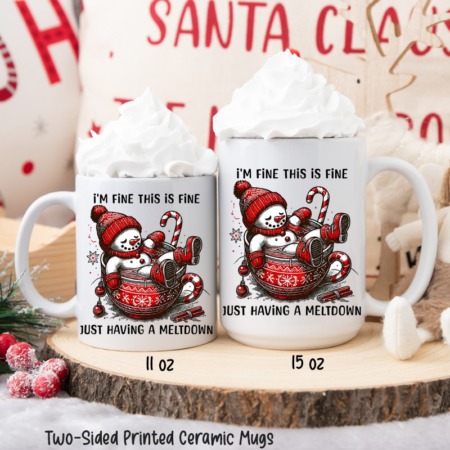 11oz Ceramic Mug SNOWMAN I’M FINE. THIS IS FINE. JUST HAVING A MELTDOWN All White Inner & Handle Two-Sided Printing One Design *minimum order 6 mugs* (order in increments of 6)