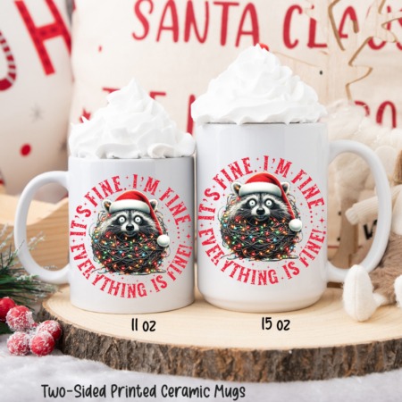 15oz Ceramic Mug RACCOON FREAKING OUT – IT’S FINE. I’M FINE. EVERYTHING’S FINE! All White Inner & Handle Two-Sided Printing One Design *minimum order 6 mugs* (order in increments of 6)