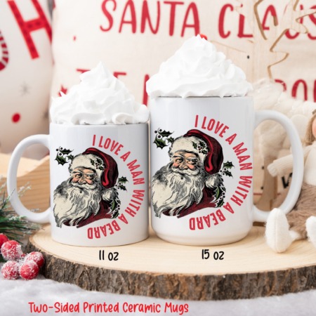 15oz Ceramic Mug I LOVE A MAN WITH A BEARD VINTAGE SANTA All White Inner & Handle Two-Sided Printing One Design *minimum order 6 mugs* (order in increments of 6)