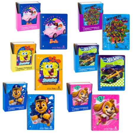 • 1-Subject Notebook College Ruled 60 Sheets Six assorted in a case pack. Licensed Barbie – Hot Wheels – Paw Patrol (Blue) – Paw Patrol (Pink) – Spongebob Squarepants – Teenage Mutant Ninja Turtles *minimum order 12 units assorted 6 designs* (order in increments of 12 mix)
