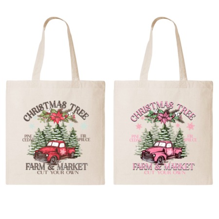 15″x16″ 5oz Cotton Canvas Shopping Tote CHRISTMAS TREE FARM & MARKET Pink & Red Truck Mix Natural Beige 26″ Shoulder Straps *minimum order 6 units* (order in increments of 6 mix)