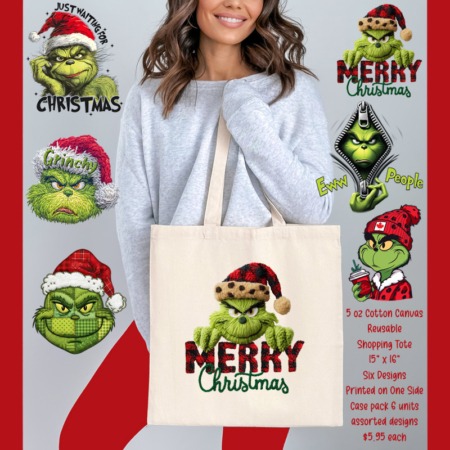 12″x17″ 5oz Cotton Canvas Santa Sack Style Reusable Gifting Bag Mix Six GRUMPY GREEN GUY SRP $11.99 each *minimum order 6 bags assorted 6 designs* (order in increments of 6 mix) **12 units left in stock**