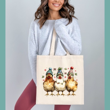15″x16″ 5oz Cotton Canvas Shopping Tote THREE ROCKING ROOSTERS FESTIVE TOQUES Natural Beige 26″ Shoulder Straps *minimum order 3 units* (order in increments of 3) **6 units left in stock**