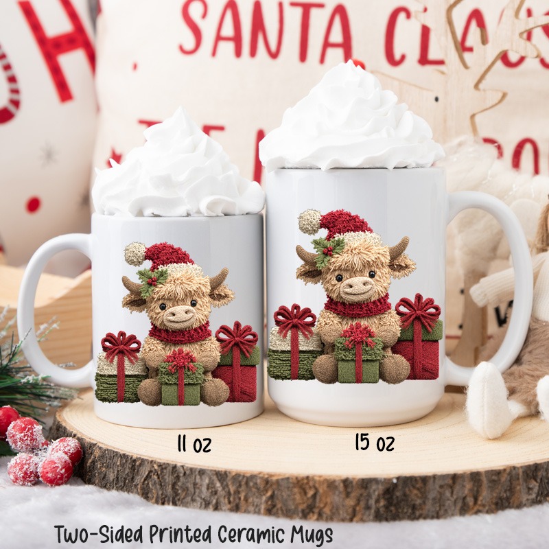 11oz Ceramic Mug Christmas Festive Novelty Mug All White Inner & Handle – FAUX KNIT STITCHING BULL CALF