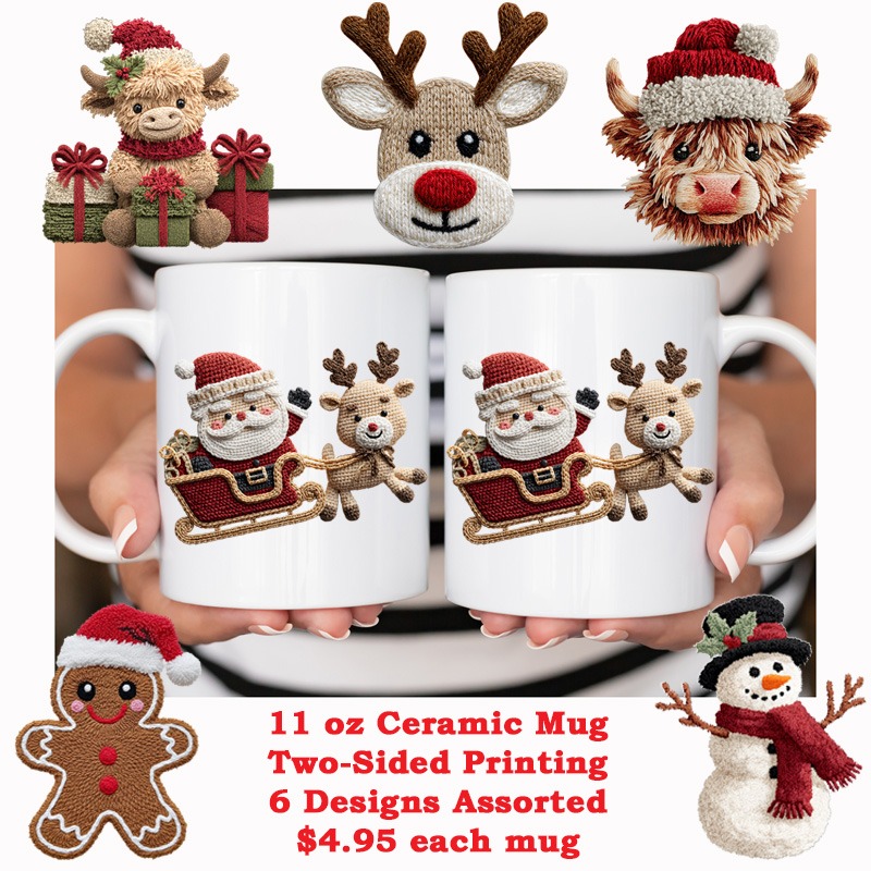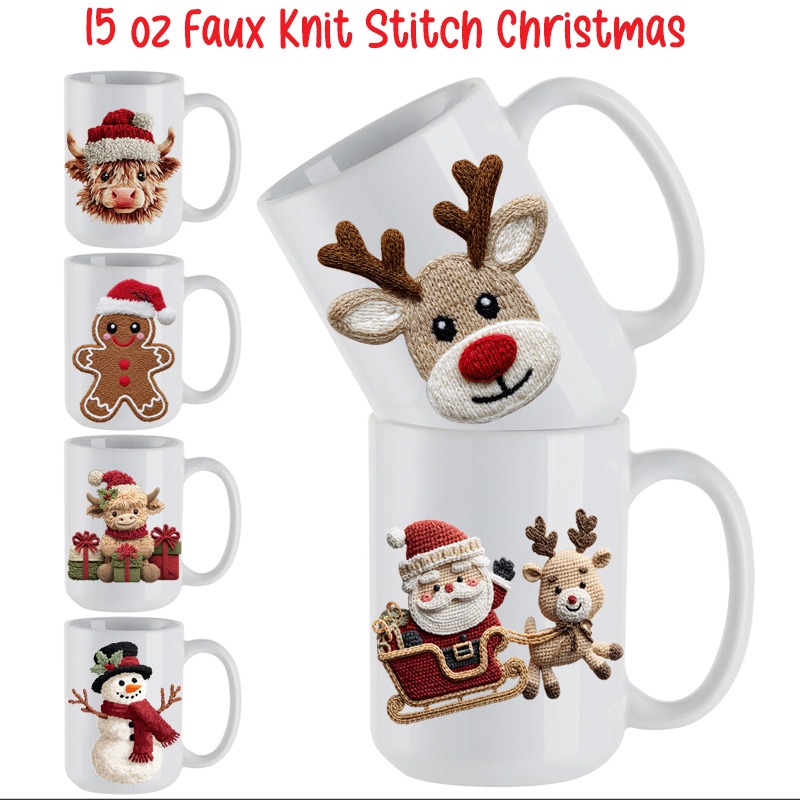 11oz Ceramic Mug Christmas Festive Novelty Mug All White Inner & Handle – FAUX KNIT STITCHING CHRISTMAS ICONS