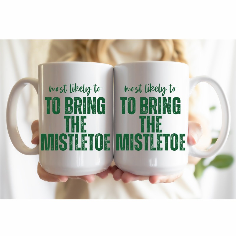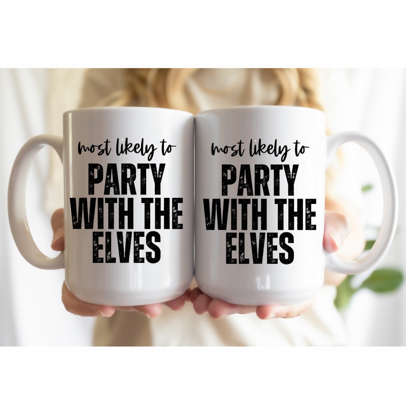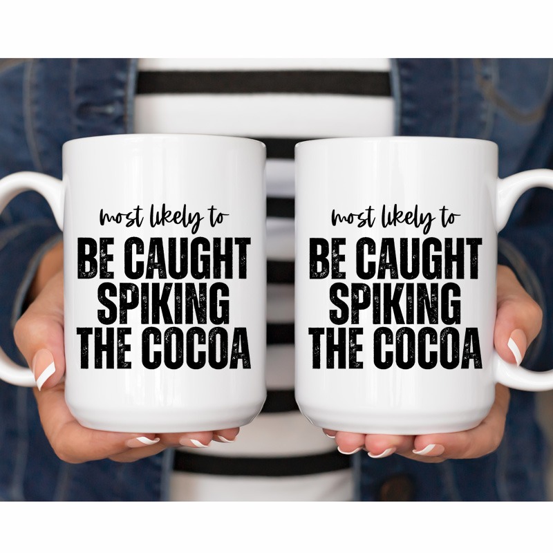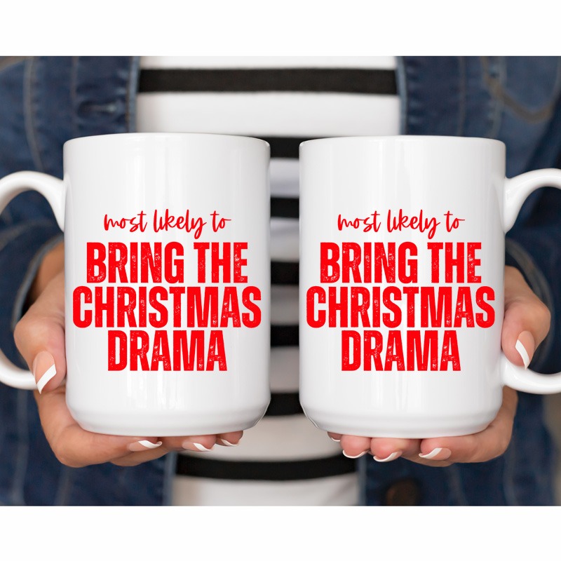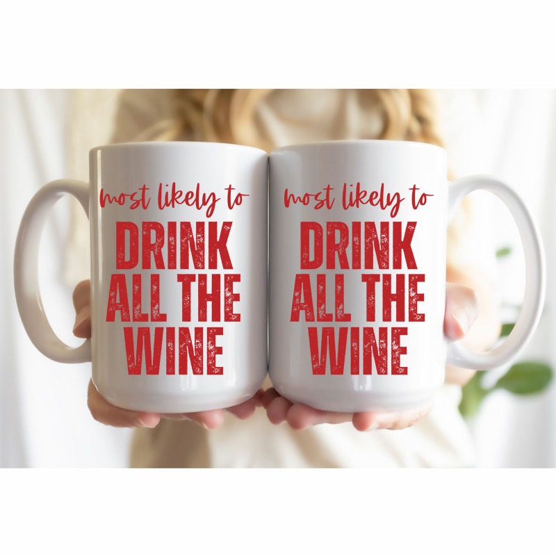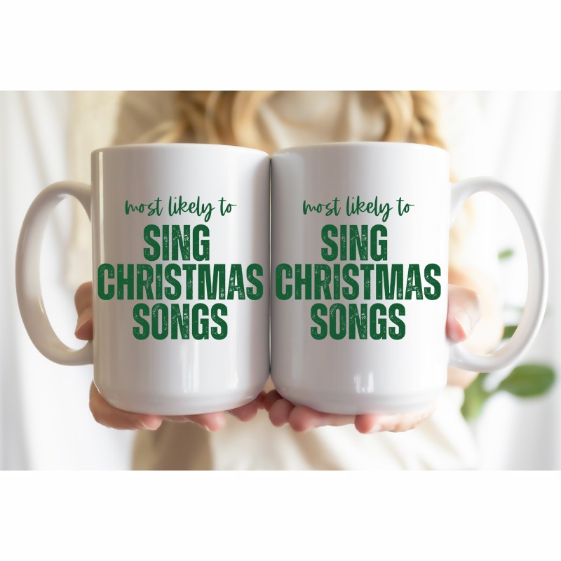 15oz Ceramic Mug CHRISTMAS MOST LIKELY TO… on All White Body Ceramic Mug 12 Assorted Designs *minimum order 12 mugs assorted* (order in increments of 12) **or select up to 6 designs to print on 12 mugs**