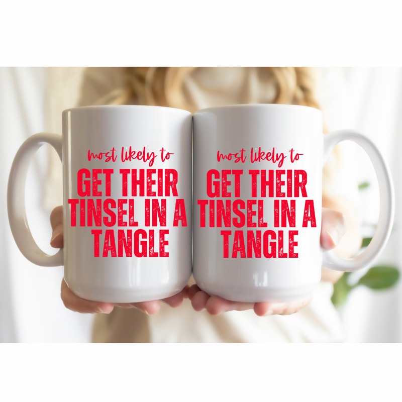15oz Ceramic Mug CHRISTMAS MOST LIKELY TO… on All White Body Ceramic Mug 12 Assorted Designs *minimum order 12 mugs assorted* (order in increments of 12) **Receive all 12 assorted OR select up to 6 designs to print on 12 mugs**