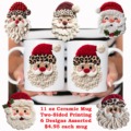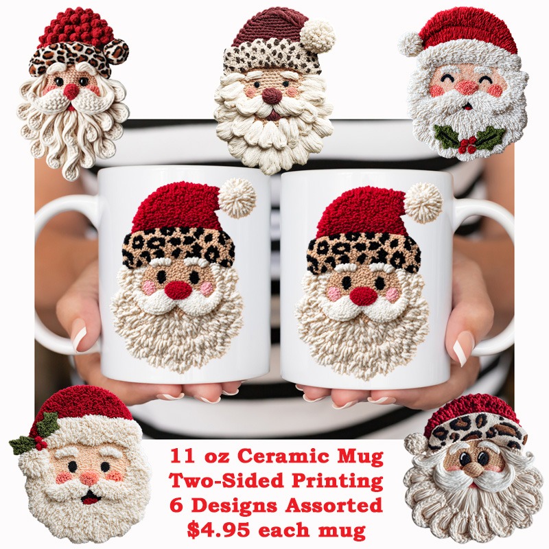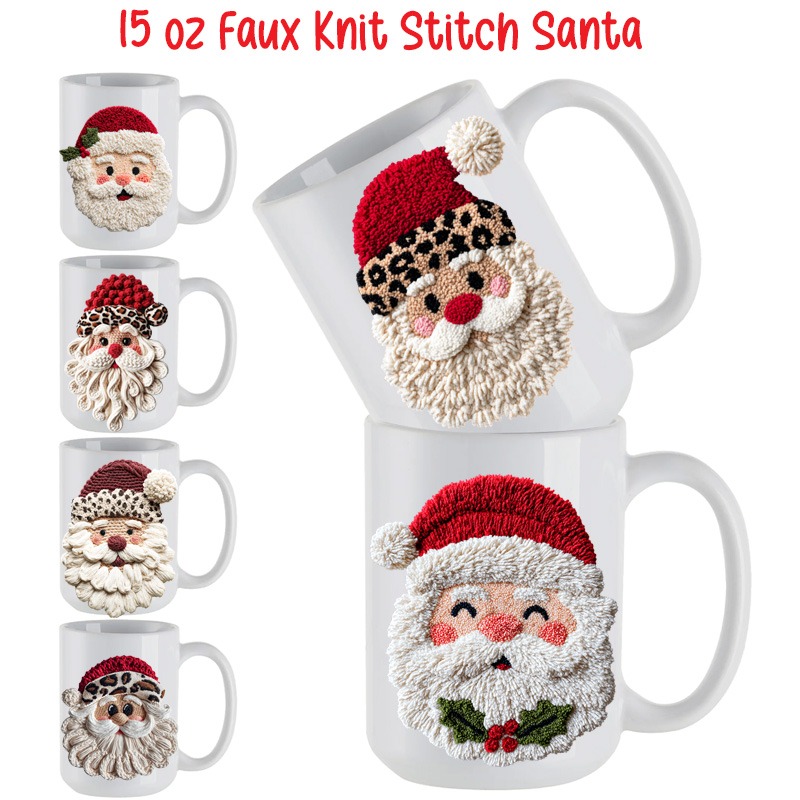 15oz Ceramic Mug FAUX KNIT STITCH SANTA 6 Designs All White Inner & Handle Two-Sided Printing 6 Assorted Designs *minimum order 6 mugs mix* (order in increments of 6)