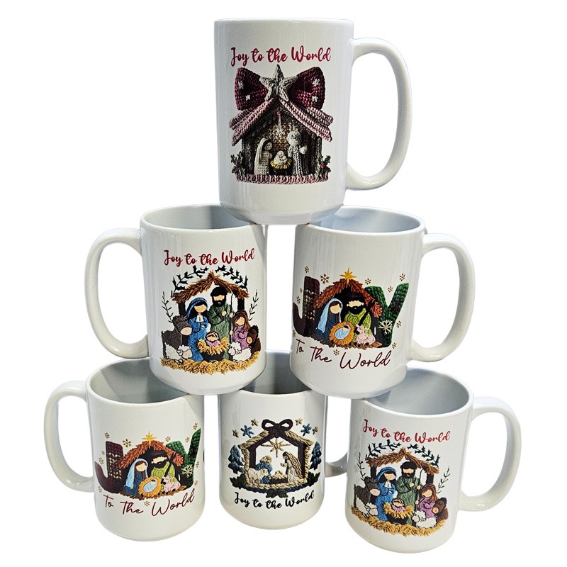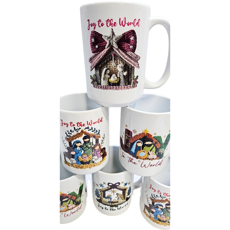 15oz Ceramic Mug Christmas Festive Novelty Mug All White Inner & Handle – FAUX KNIT STITCHING JOY TO THE WORLD 4 DESIGNS