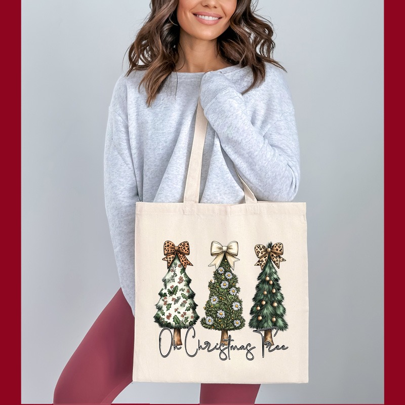 15″x16″ 5oz Cotton Canvas Shopping Tote THREE TREES WITH BOWS OH CHRISTMAS TREE Natural Beige 26″ Shoulder Straps  *minimum order 3 units* (order in increments of 3) **6 units left in stock**