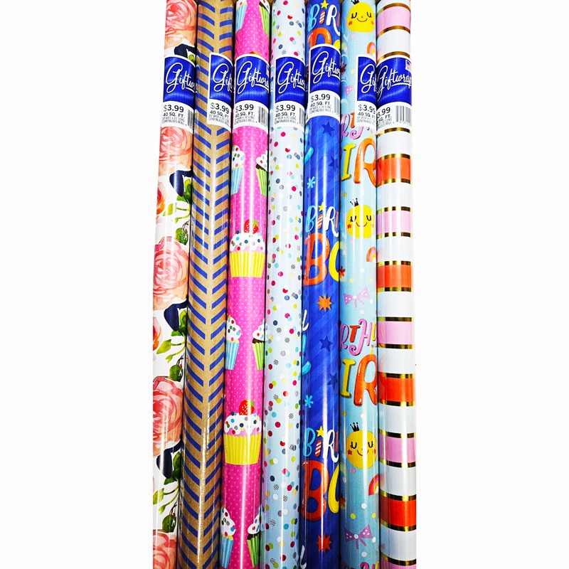 40 SQ.FT. Everyday Gift Wrap 6 Designs Group B PRE-PRICED US $3.99 each roll (CAD Value $5.59 /roll) *minimum order 6 units mix rolls