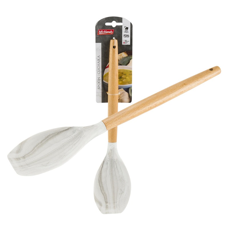Mr Handy Silicone Spoon 12.5″ Wooden Handle Heat Resistant White Gray Marble Effect
