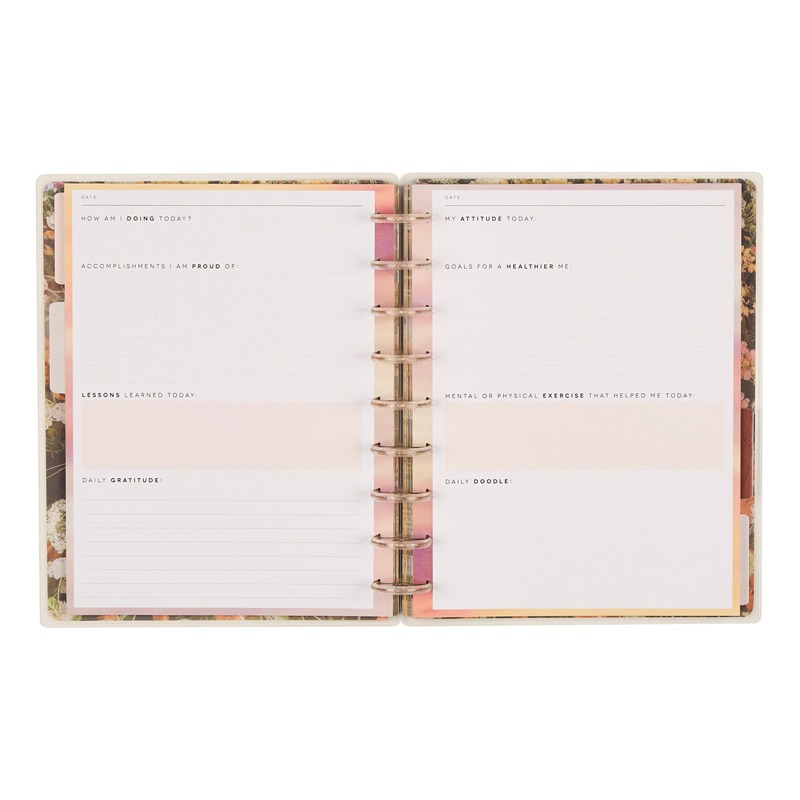 Uses Happy Planner’s disc-bound system to add and remove pages easily
