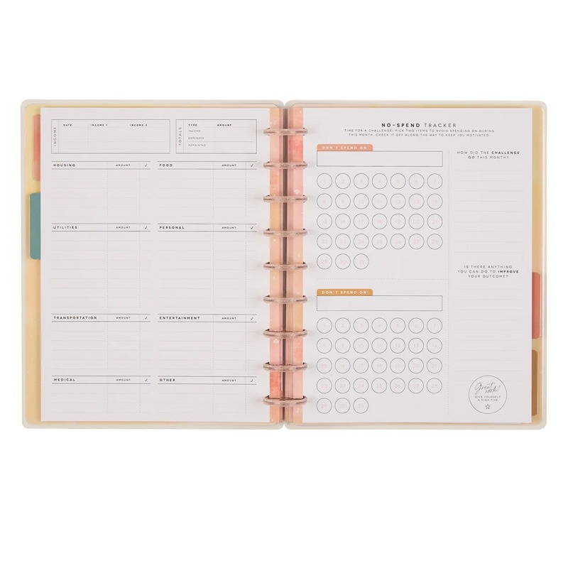 Includes 40 guided sheets to track expenses, savings, monthly bills, and budget goals